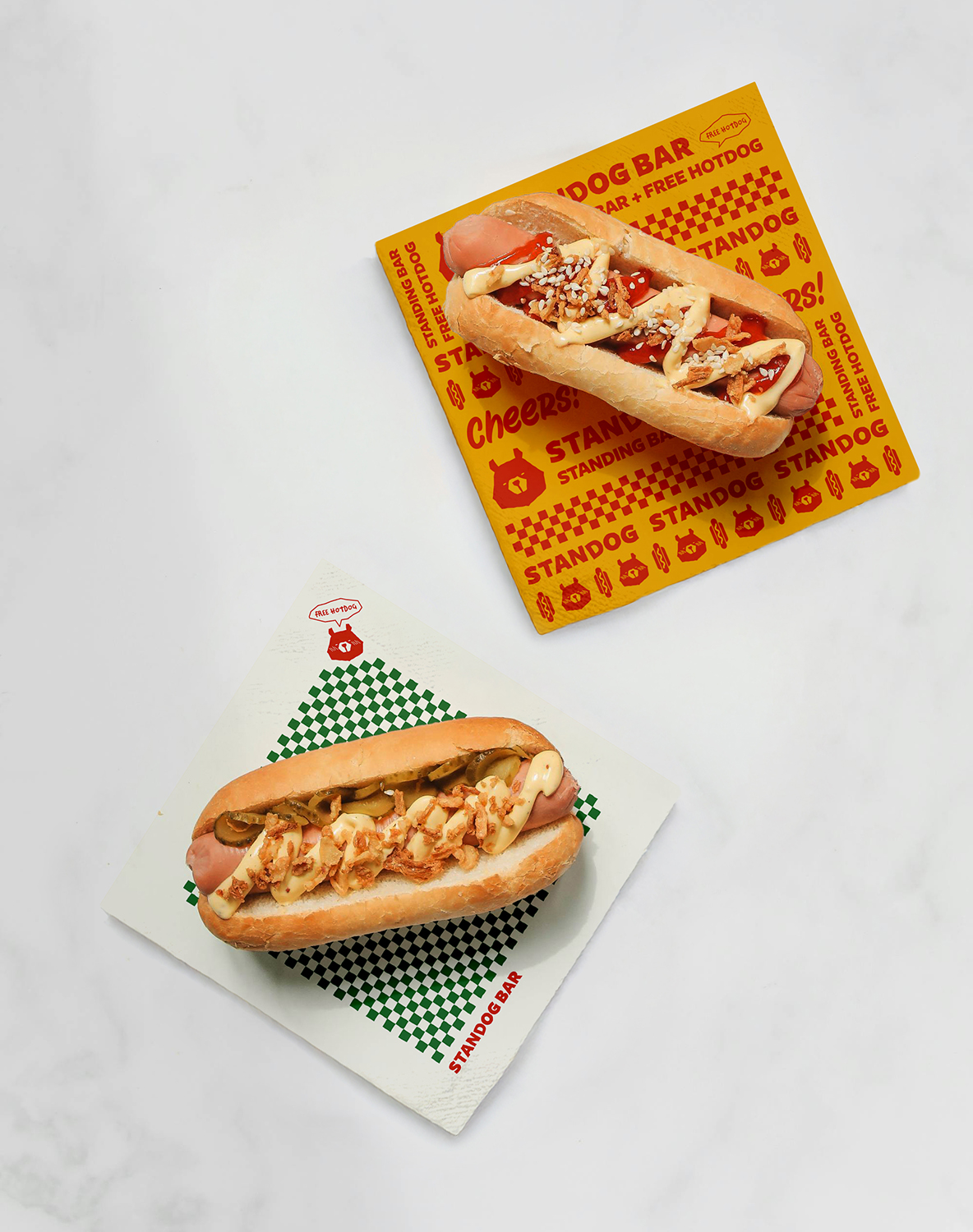 For Standog Bar’s branding, we created an identity that emphasizes its casual and straightforward charm. The logo combines bold, weighty typography with a nonchalant bear character holding a beer, capturing the mood of winding down after work with a relaxed drink. To make the brand name more intuitive, I incorporated beer-inspired elements that immediately hint at the bar’s core experience. The ketchup-and-mustard color palette, inspired by the free hotdogs served with each beer, adds a playful, appetizing accent while preventing the identity from feeling overly serious or polished. This combination of bold shapes and warm, food-related hues strikes a perfect balance between casual comfort and strong visual presence.